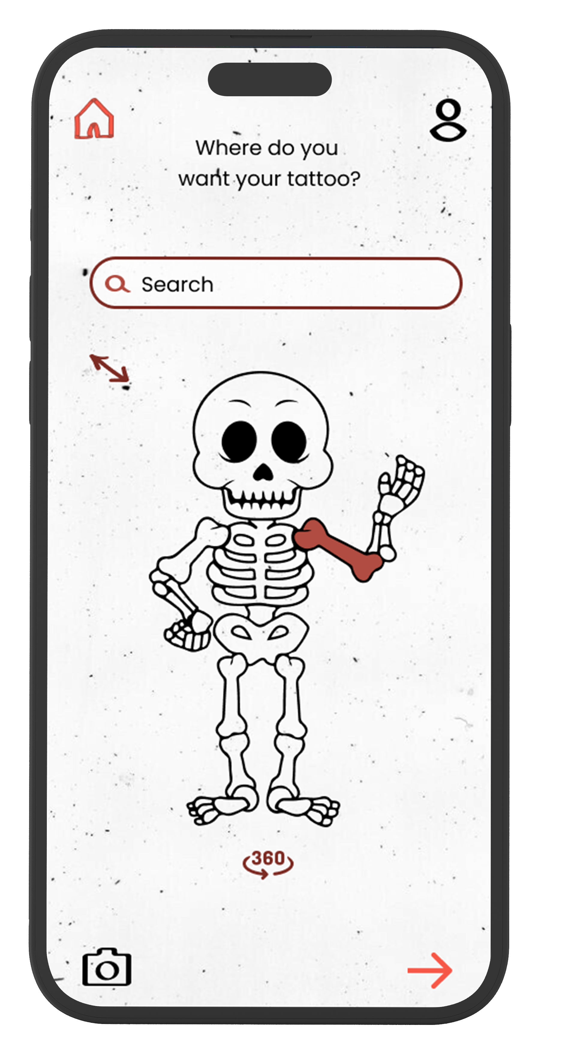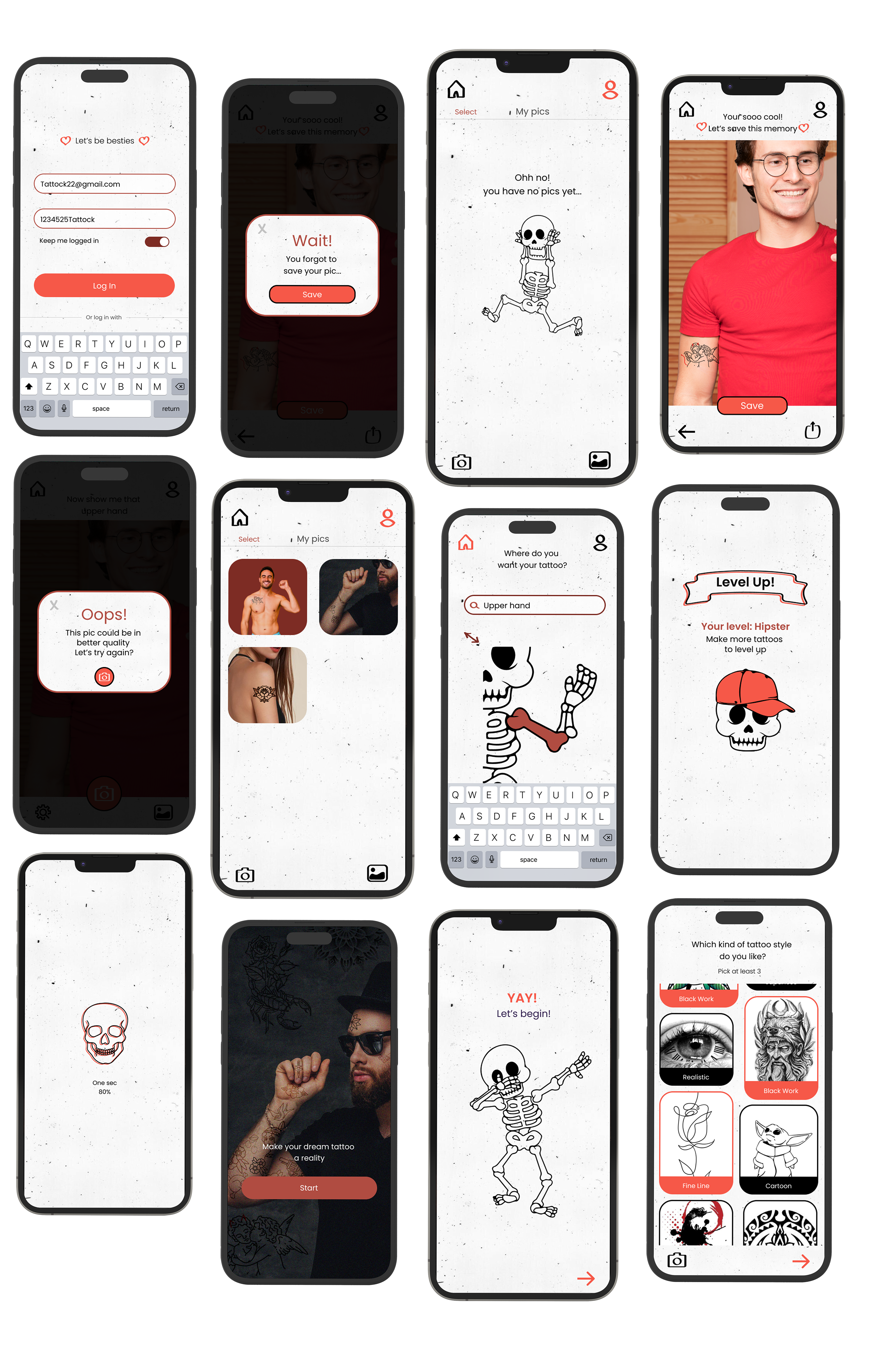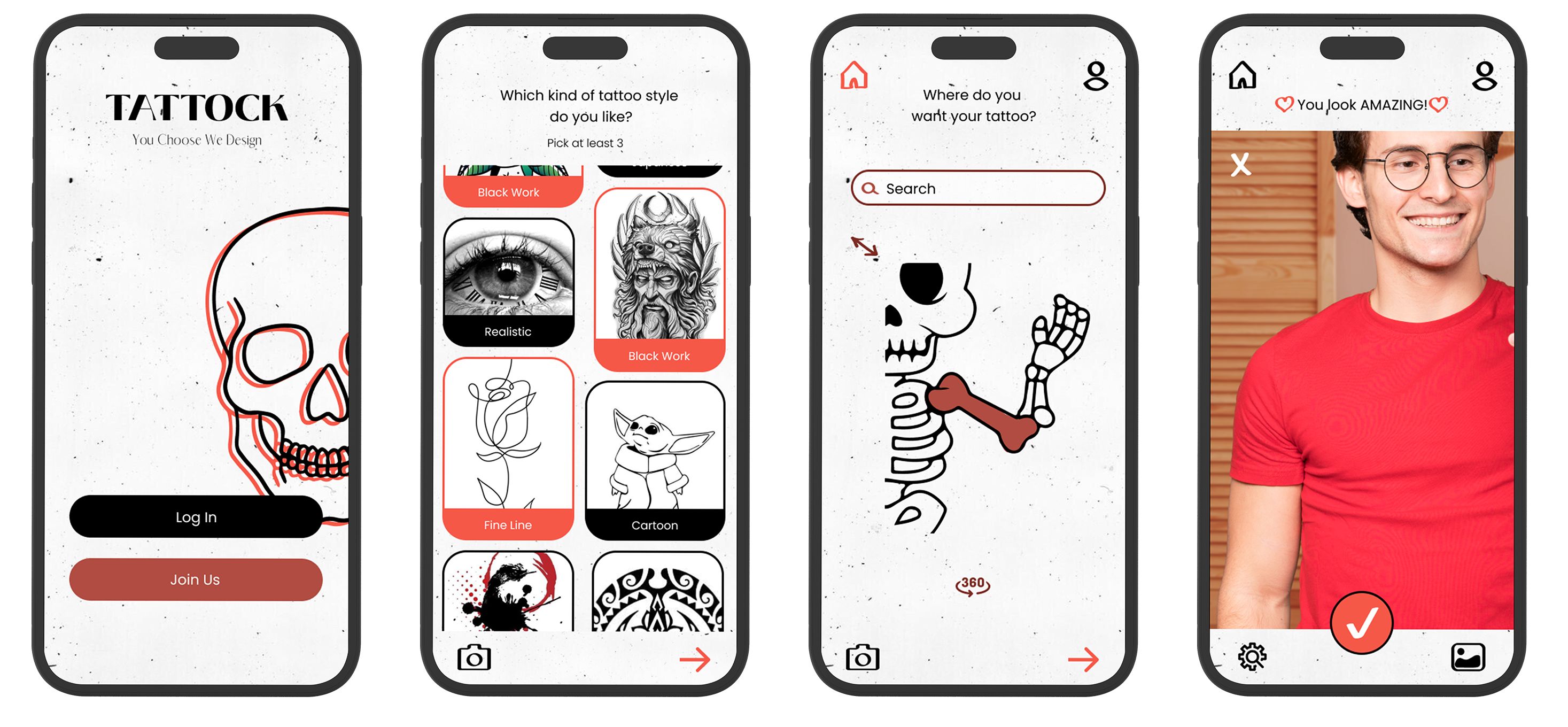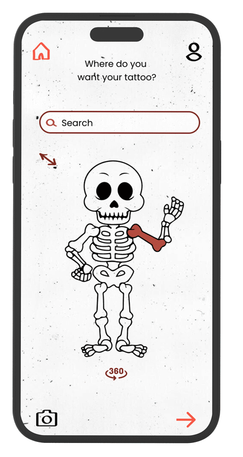 The application's graphic language is illustrative and hipster with black, white, and red colors that are associated with the tattoo world. The skeleton figure and other illustrations are repeated throughout the app to create an authentic feel. The goal is to convey a youthful and flirtatious vibe that makes the user feel special.