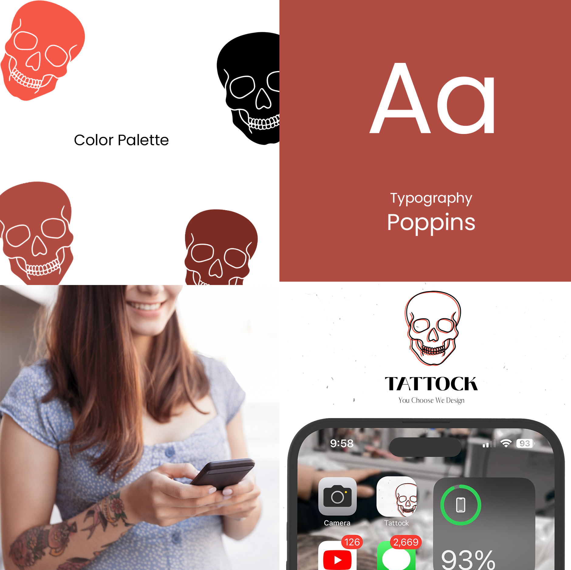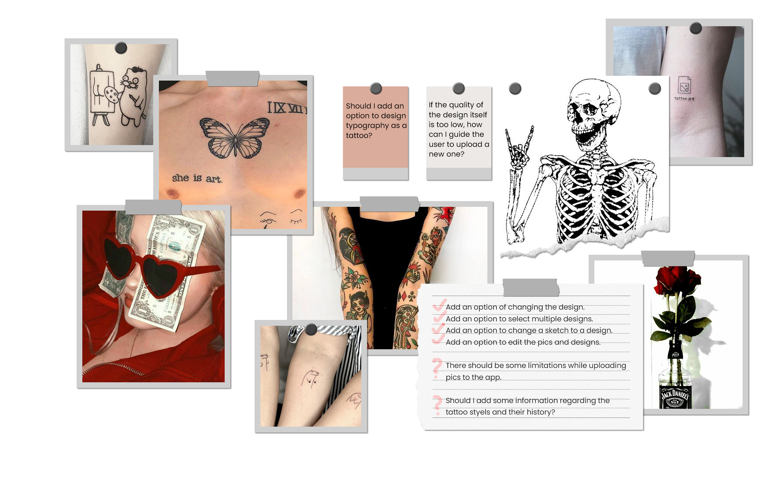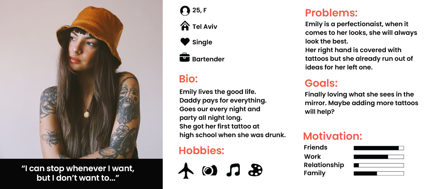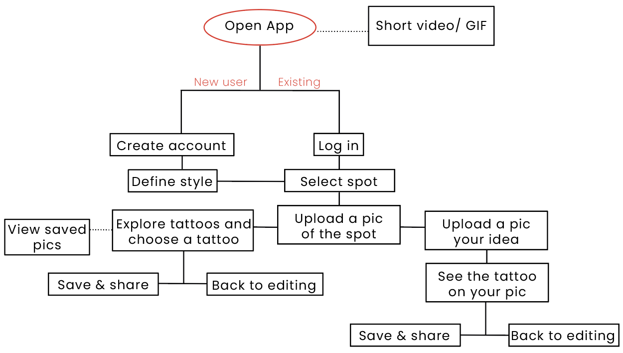 The application's graphic language is illustrative and hipster with black, white, and red colors that are associated with the tattoo world. The skeleton figure and other illustrations are repeated throughout the app to create an authentic feel. The goal is to convey a youthful and flirtatious vibe that makes the user feel special.